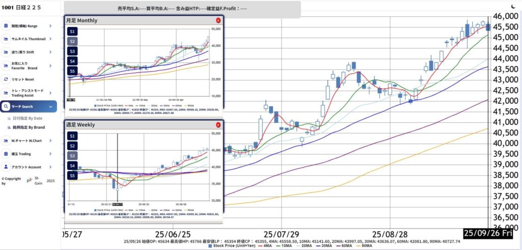 日足:最下点から15本の後に16本目(9/26㈮)で4MA割込み陰線になった。また、4MA(赤)の上昇傾きが緩やかになってきている。来週は陰線が多くなるとローソク足が10MAを割込み、30MA付近またはそれ以上に下落する可能性がある。従って、来週は45000円~45800円での横ばい状態か、その後、44000円を割りこむ勢いの下落パターンになる可能性がある。