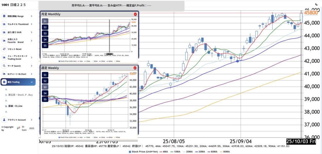 週足:先週から25週長期4MA(赤)と10MA(緑)平行、長期上昇中。