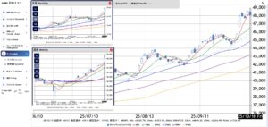 次に、移動平均線にも注目しましょう。移動平均線とは一定期間の終値の平均をつないだ線で、株価の大まかな流れ(トレンド)を把握するのに役立ちます。例えば、25日移動平均線が上向きで株価がその上にあれば上昇トレンド、下向きで株価が下回っていれば下降トレンドと判断できます。また、短期移動平均線と長期移動平均線の交差(ゴールデンクロスやデッドクロス)から買い時・売り時のシグナルを読み取ることも可能です。ローソク足と移動平均線を組み合わせることで、今の株価が高いのか安いのか、売り時・買い時かどうかといった基礎的な分析ができるようになります。
