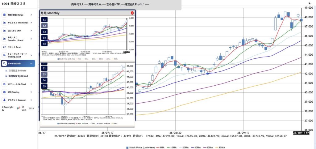 日経225平均株価47000円~48500円の横ばい状態が一時的に続くが、その後は月足と週足が安定的に上昇しているため、政局が安定したら上昇の可能性大
