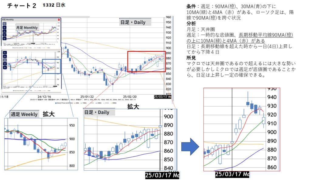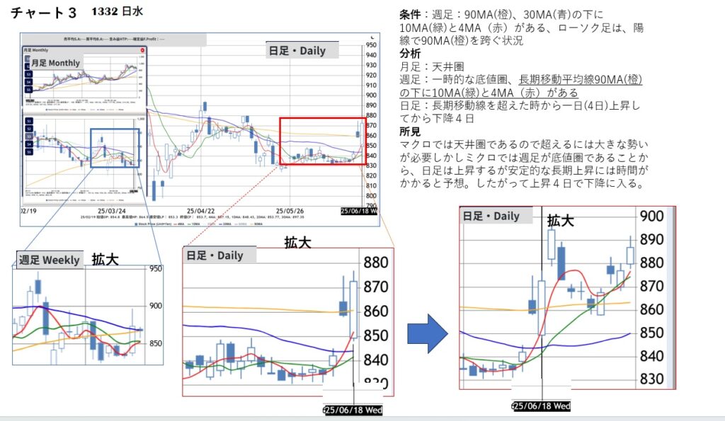 2871 ニチレイ 2025年10月21日 ローソク足は、陽線で90MA(橙)を跨ぐ状況のトレード