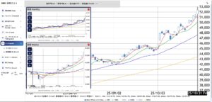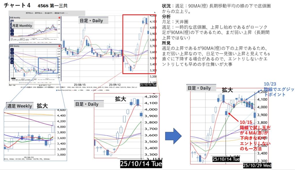 チャート1の状況は、週足は90MA(橙)の上、日足を見ると上昇12日で陰線で4MA(赤)を割った状態である。