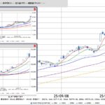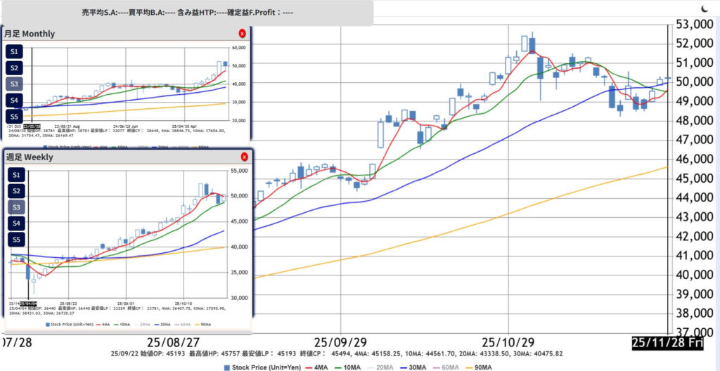 月足は7カ月連続の上昇基調を保ちつつ、今月は陰線ながら短期線の上に位置しており強さを残しています。週足はやや勢いが弱まりつつも大きな上昇トレンドは継続中。日足では下落後に48,500円付近で反発し、短期線も上向きに転換。51,000円へ再上昇する可能性がある一方、50,200円付近で再び下げる展開もあり得ます。来週前半の動きが今後の方向性を左右しそうです