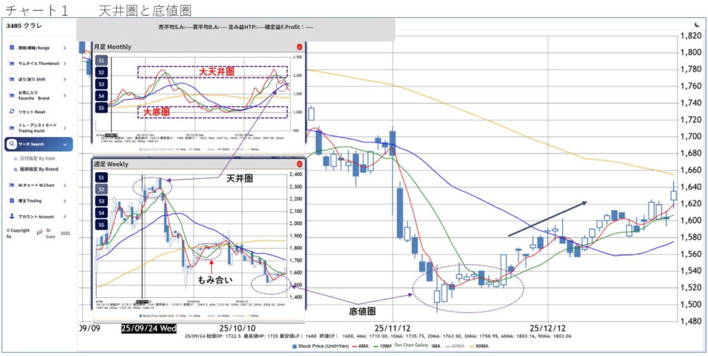 月足チャートでは、過去数年間における現在の価格の「立ち位置」を確認します。具体的には、大天井圏(過去の最高値圏)や大底圏(過去の最安値圏)と比較して、今の価格水準がどの程度の高さ・低さにあるかを見極めます。St-Gain独自の4本の移動平均線(4ヶ月MA、10ヶ月MA、30ヶ月MA、90ヶ月MA)を月足に反映させることで、長期トレンドの方向性も掴みやすくなります。例えば、月足でローソク足が短期線である4MAの上側を維持して推移していれば、多少の調整(陰線)があっても長期的な上昇トレンドは継続中と判断できます。一方、価格が90MA(90ヶ月=約7.5年の平均線)より大幅に下に位置する場合は、歴史的にも割安な水準(大底圏に近い)と考えられ、逆に90MAより大幅上なら割高圏(大天井圏に近い)かもしれません。こうした長期視点での支持帯・抵抗帯を把握することで、現在の相場が「長期的に見てどのゾーンにいるのか」を理解できます。月足で掴んだ大局観は、週足・日足での分析の土台となり、日足の値動きの方向性を判断する上で重要な背景情報となります。