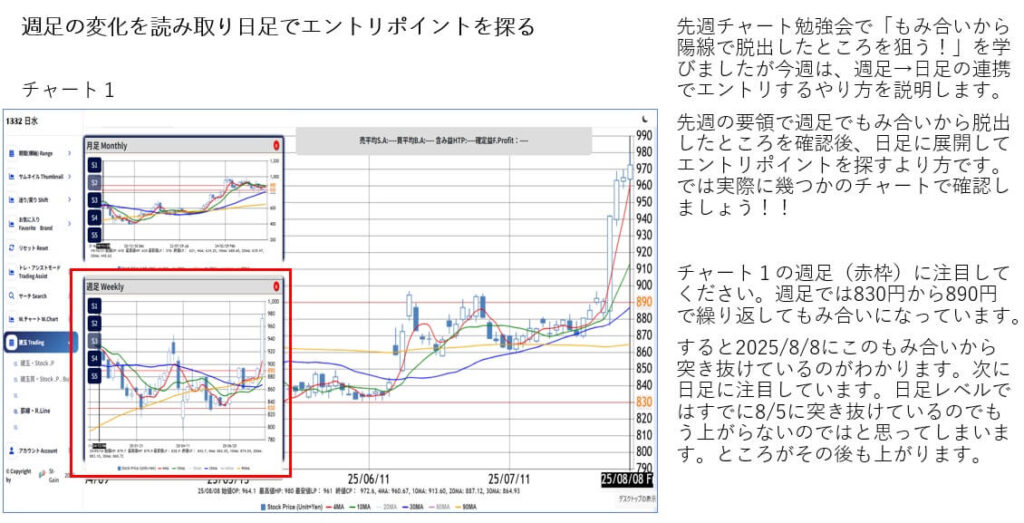 週足で価格がもみ合い相場から上方向へ脱出する場面を見極め、その後日足に展開してエントリポイントを探す手法を解説。日足だけでは高値に見えても、週足の流れを確認することで安心して判断できる。複数チャートの実例を用い、初心者でも実践しやすいトレードの考え方を紹介する。