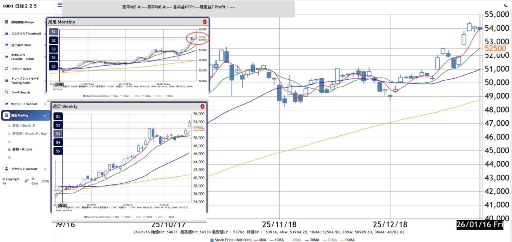 直近の最下点から10カ月連続で上昇しており、長期的な上昇基調は依然として強い。直近では2カ月間のもみ合いを経た後、陽線で前回高値である52,500円を明確に上抜けた(月足チャートの赤丸で示した箇所)。この動きは、長期トレンドが再び加速する可能性を示唆している。