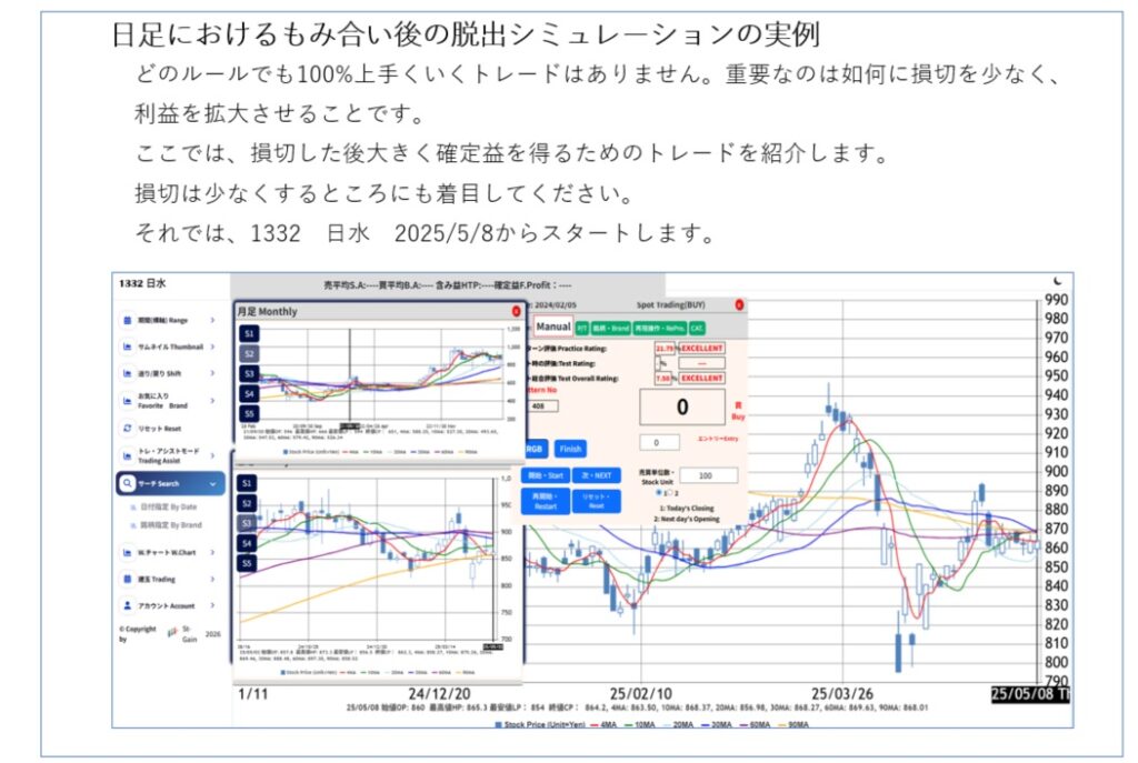 実チャートを用いたシミュレーションのため、机上の理論ではなく再現性のある練習例として活用できます。