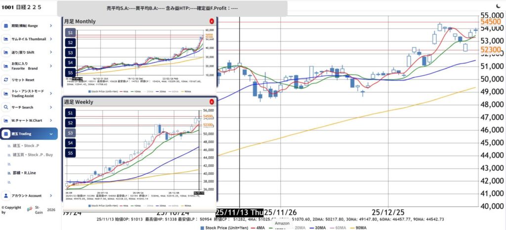1/23に出現したコマを起点として、来週に大幅な上昇となり54,000円を明確に超える陽線が出現すれば、再び4MA(赤)が10MA(緑)を上抜け、上昇のパーフェクトオーダーが完成する可能性もある。しかし、その可能性は現時点では高いとは言い難い。むしろ、4MA(赤)の勢いを考慮すると、少なくとも数日は下落または調整局面に入る可能性が高い。その後は、再びレンジ相場へ移行する展開が想定される。