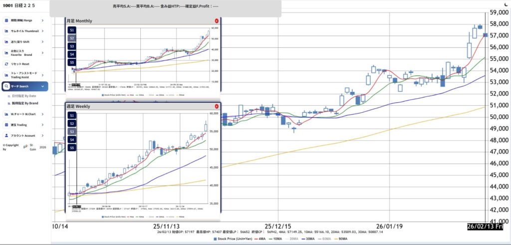 週足において4MA(赤)と10MA(緑)が一定の間隔を保っている点は、トレンドの持続力を示す重要な要素である。この乖離が急速に縮小しない限り、中期的な上昇継続の可能性は高いといえる。一方、日足では2月12日以降に短期的な調整が見られるが、移動平均線の並びと角度に大きな崩れはない。来週前半は一時的な下押し局面が想定されるものの、その後再び上昇基調へ回帰するシナリオが有力である。