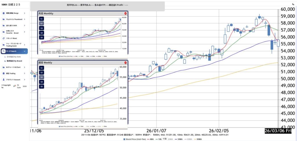 今週の日経平均は、月足では11カ月連続上昇という強い長期トレンドを維持しているものの、週足では陰線が形成され、短期調整入りの兆候が見られた。日足では3月3日に大陰線が出現し、短期移動平均線を大きく割り込む急落が発生し、一時54,000円を割り込んだ。その後は押し目買いにより55,000円台まで回復したものの、相場は依然として不安定な状態にある。来週は54,000円〜55,000円のレンジ相場、もしくはさらなる下落への警戒が必要な局面である。