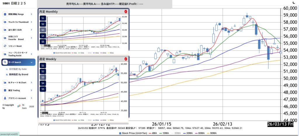 今週の日経平均は、中東情勢の緊張を背景に下落基調が続いた。月足では依然として長期上昇トレンドを維持しているものの、週足では4MAの傾き下向きに転じ、10MAを割り込む寸前の展開となった。日足では急落後、60MA付近で下げ止まりつつあるが、短期移動平均線は下降方向を示している。市場心理を示す日経VIXも高水準にあり、相場は不安定な状態である。来週は52,500円〜54,500円のレンジ、もしくはさらなる下落への警戒が必要な局面である。