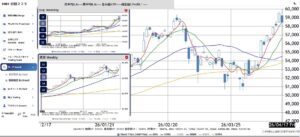 来週も上昇の可能性が高く、60,000円突破も視野に入る局面である。日足では4MAと10MAの乖離が過度に拡大しておらず、持続的な上昇トレンドの形を維持している。